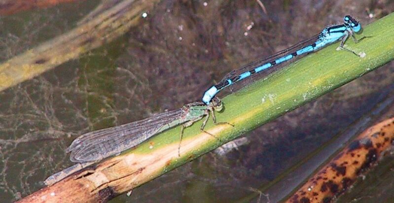 Becher-Azurjungfer (Enallagma cyathigerum) (m) + (f) 28.08.2001 15:08 Bw:65 mm PA, Blende: 5,0 Zeit: 1/500 mM, Belichtungsausgleich: -1, AF