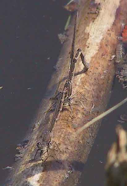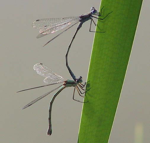 Die Gemeine Winterlibelle (Sympecma fusca) (m) + (f) ist häufig die erste Libelle, die im Frühjahr zu sehen ist. 17.05.2002 11:42 Bw:70 mm PA, Blende: 5,6 Zeit: 1/500 mM, Belichtungsausgleich: -1 1/3, AF